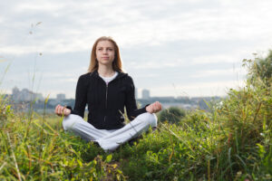 Young girl makes yoga exercises outdoors.